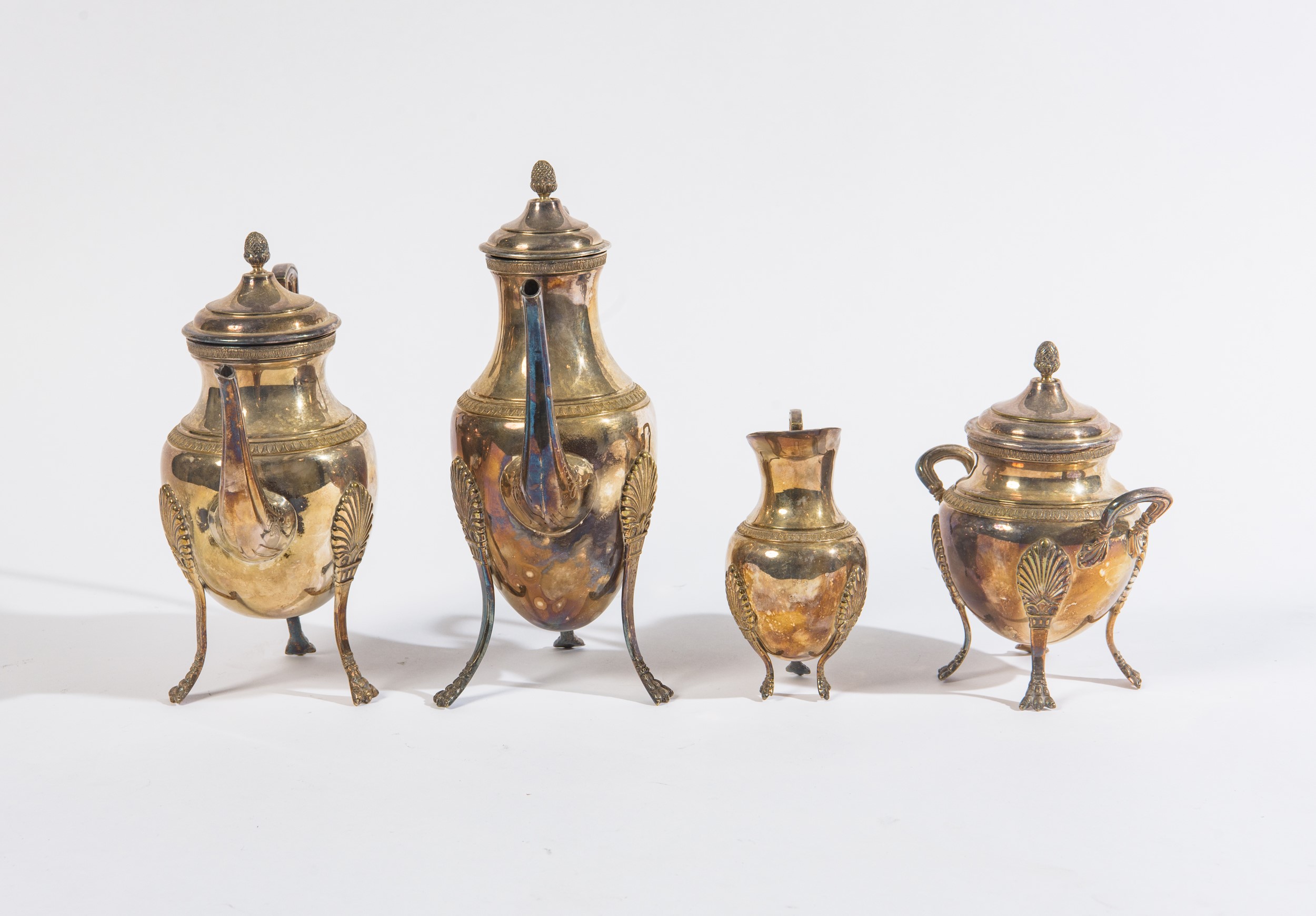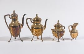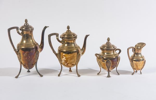 Peso: 1,5 kg. Composto da: una teiera, una caffettiera, una lattiera, una zuccheriera. Poggianti su eleganti zampe zoomorfe. Decorazioni a palmette.