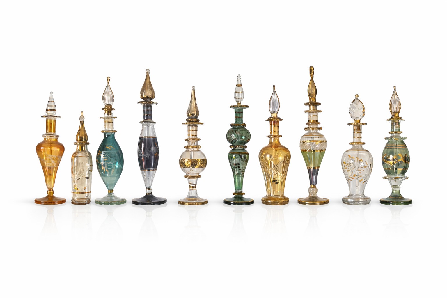 Composto da: 5 boccette portaprofumo in vetro (h. 15 - 18 cm), 10 bottiglie portaprofumo in vetro di varie dimensioni.