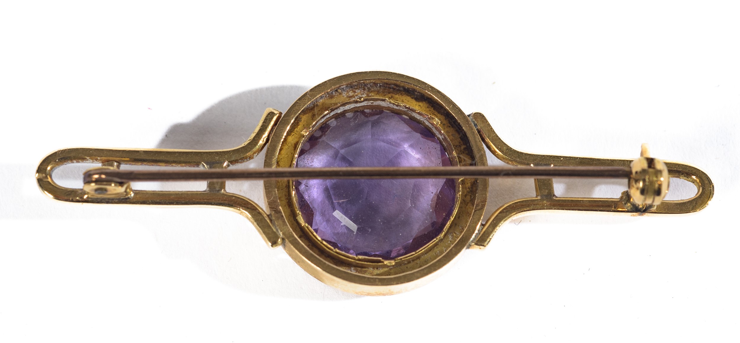 Al centro è incastonata un’ametista sfaccettata di forma rotonda, di colore viola medio, inserita entro una cornice a grani che ne valorizza la brillantezza. Ai lati si sviluppano due bracci rettilinei con struttura aperta, collegati al perno posteriore. Peso totale lordo 6,77 grammi.