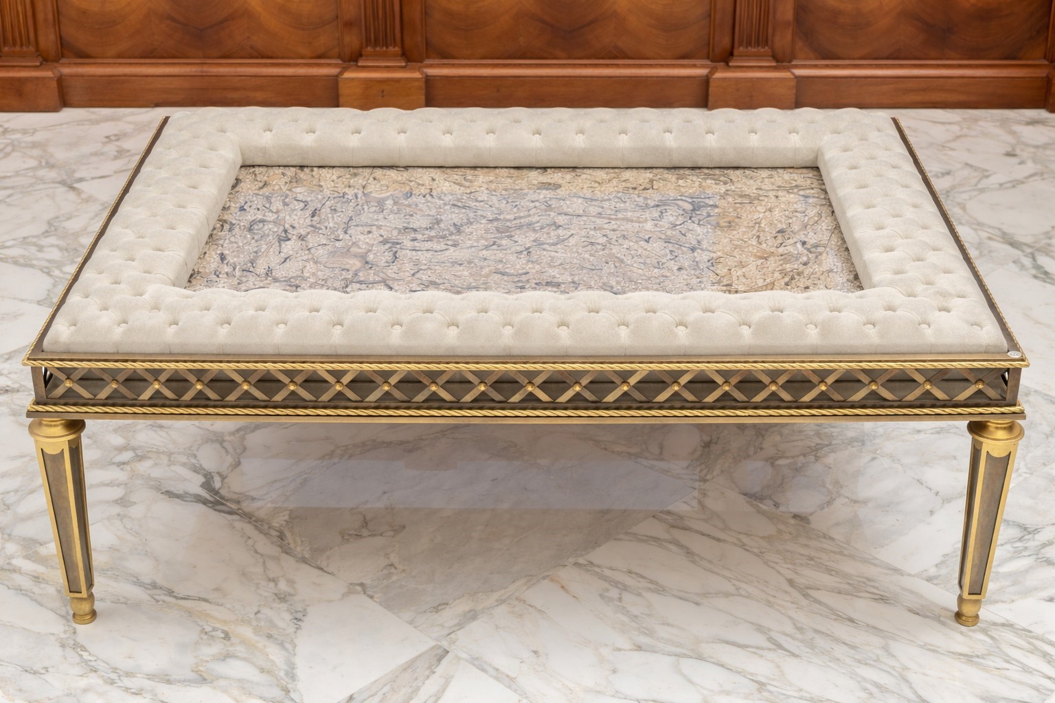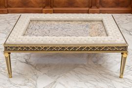 Raffinato tavolino da salotto in bronzo dorato, di gusto neoclassico, caratterizzato da struttura elegante con gambe scanalate e fascia perimetrale decorata a motivi geometrici.