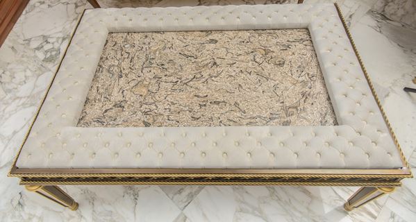 Il piano presenta un originale inserto centrale imbottito in capitonné incorniciato da elemento decorativo.