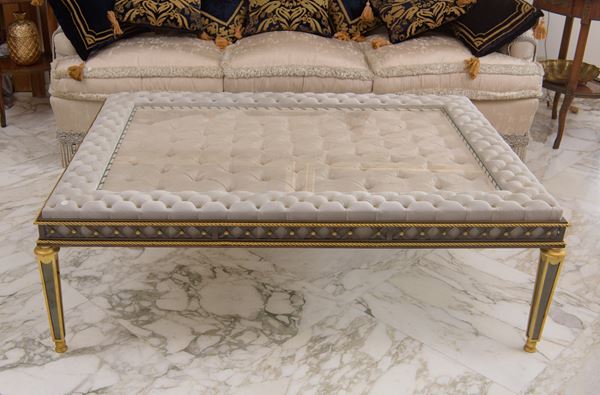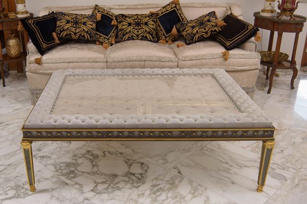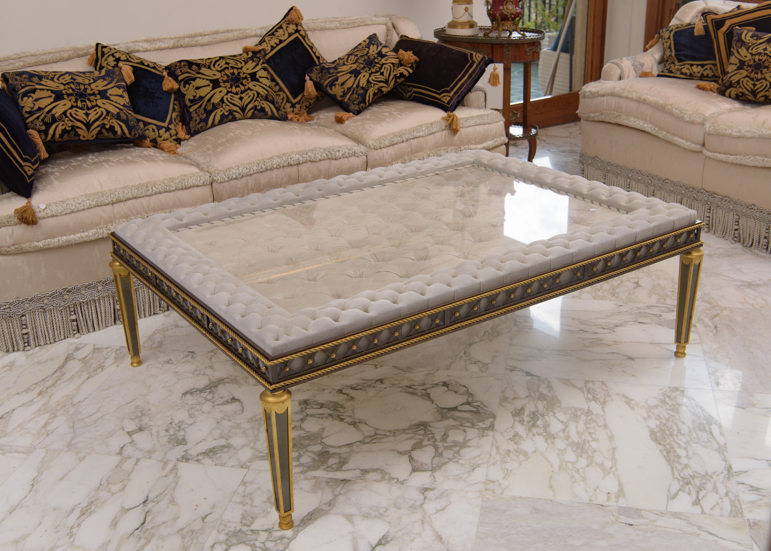 Tavolino da salotto in stile neoclassico. in metallo dorato e piano superiore in vetro inserito entro cornice imbottita rivestita in tessuto capitonné. Il piano è caratterizzato da una superficie centrale trasparente che lascia intravedere l’imbottitura sottostante lavorata a bottoni, mentre la fascia perimetrale presenta decorazioni geometriche e borchie metalliche su fondo scuro, con profilo rifinito da cordonatura dorata. La struttura è sostenuta da quattro gambe dritte rastremate con elementi metallici dorati e inserti decorativi verticali, poggianti su piccoli piedini.