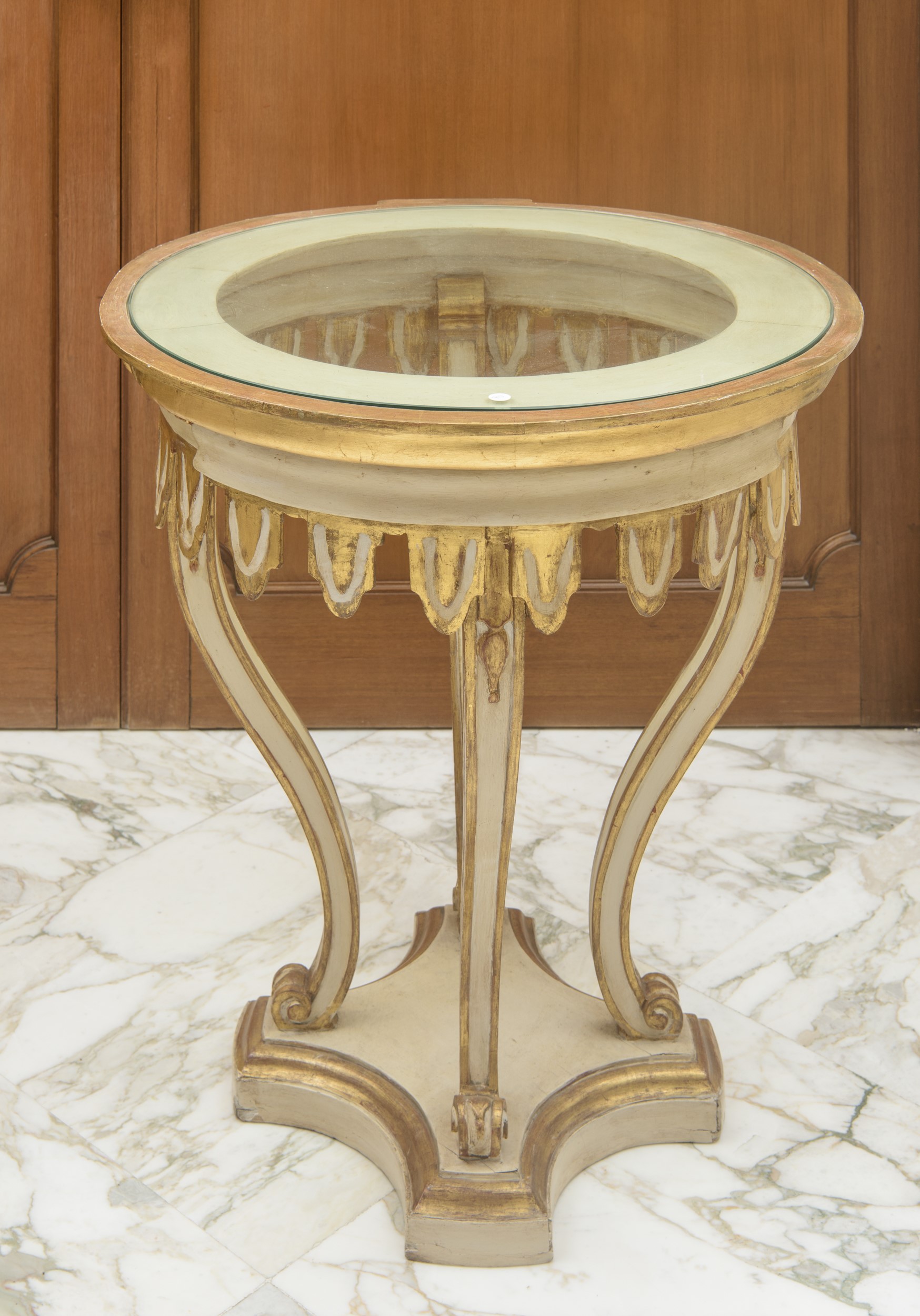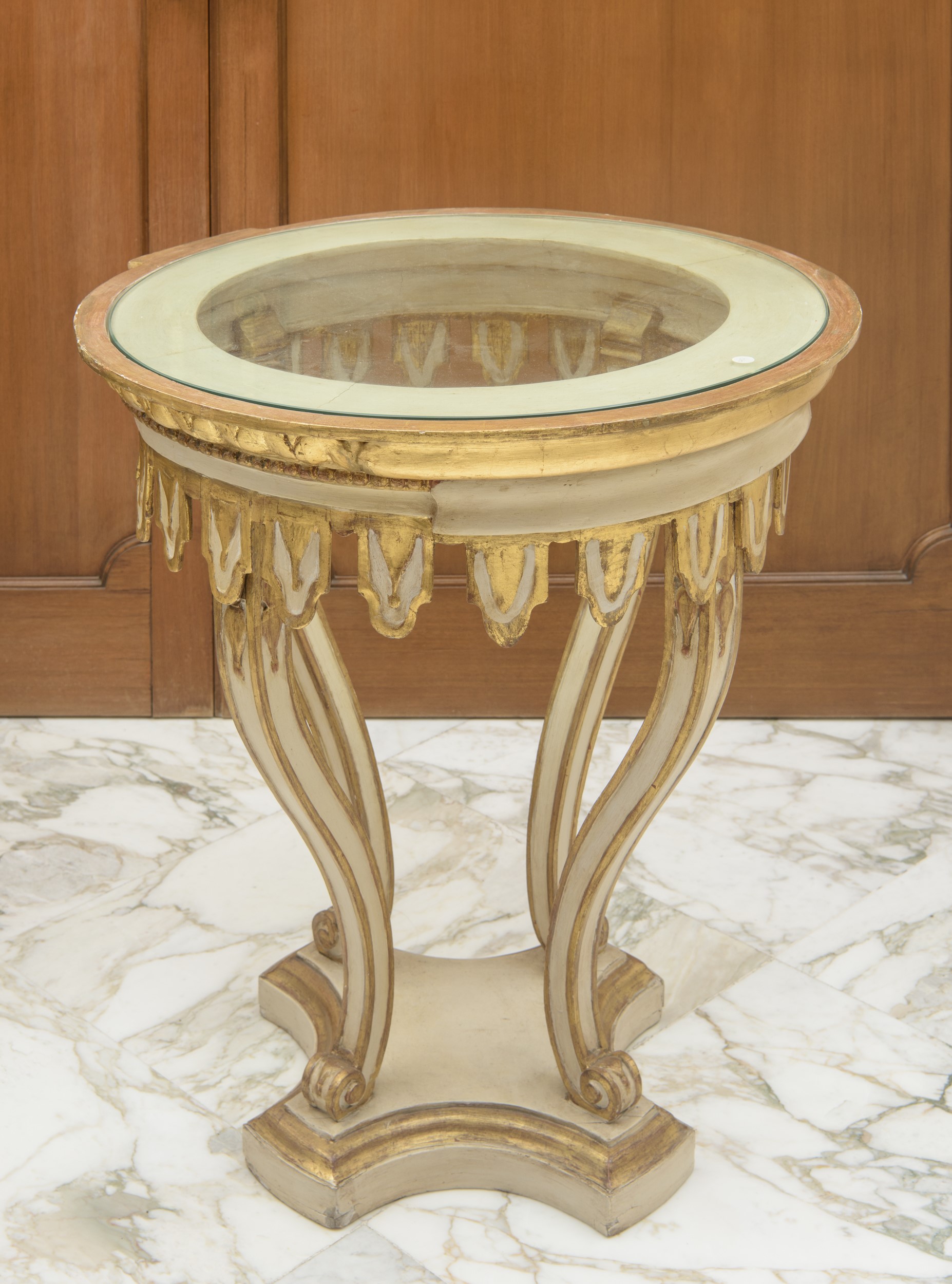 Tavolino rotondo da salotto, realizzato in legno intagliato, laccato e dorato. Il piano circolare presenta un inserto in vetro incassato.