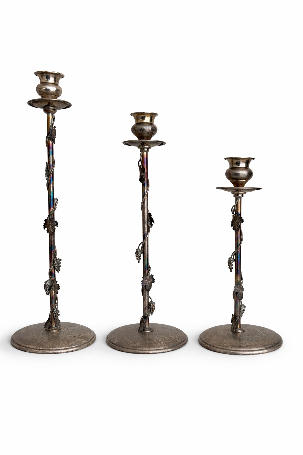 Tre portacandele da tavola in metallo argentato, di linea slanciata, con fusto decorato da tralci vegetali applicati con foglie e grappoli d’uva.