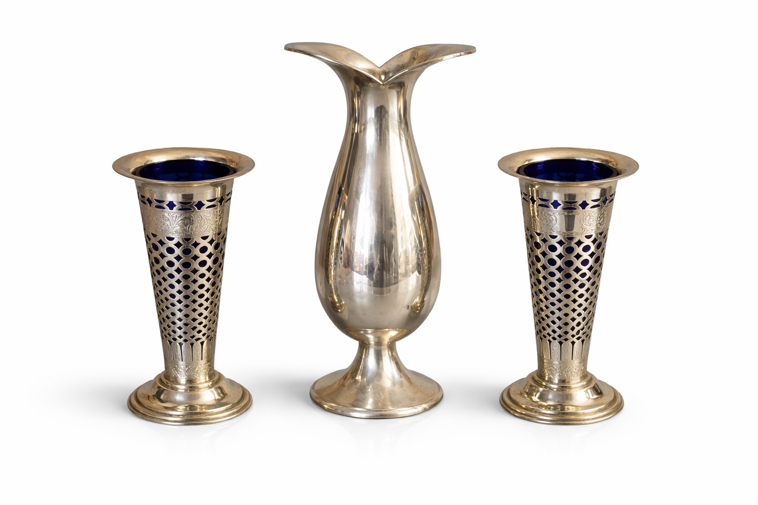 una coppia di vasi con opalina blu (110 gr. ciascuno)(h. 18 cm), 1 vaso (370 gr. ciascuno)( h. 25 cm).