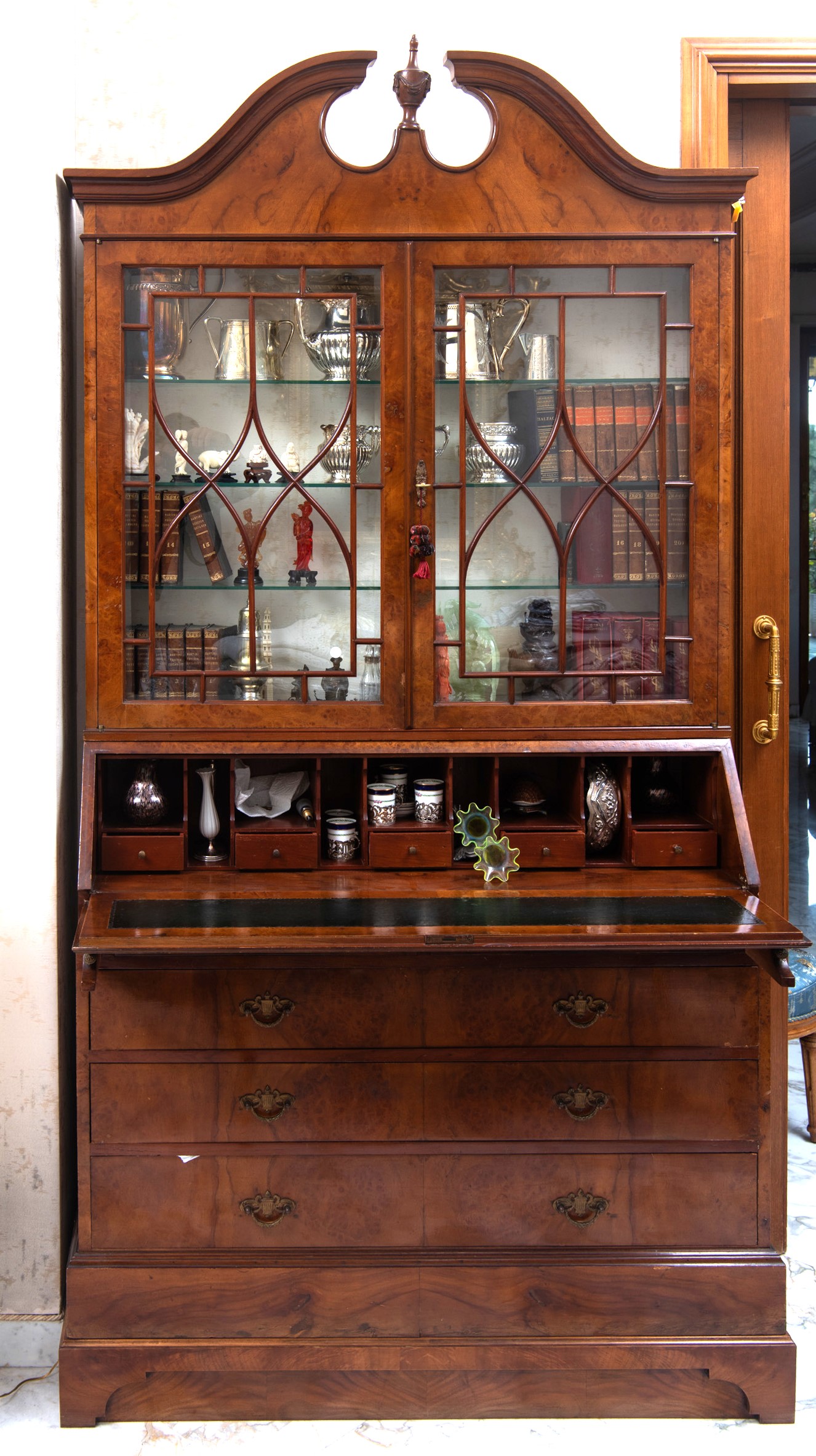 Trumeau in stile inglese George III, realizzato in legno massello con impiallacciatura in radica (probabile noce o mogano). Il mobile presenta struttura a due corpi: parte inferiore con ribalta inclinata celante vano scrittoio e tre ampi cassetti sottostanti, dotati di maniglie in metallo; parte superiore costituita da alzata con due ante vetrate suddivise da eleganti montanti a disegno geometrico ogivale, contenenti ripiani interni. Il cappello è sagomato con cimasa mossa e pinnacolo centrale, mentre la ribalta è decorata da intarsio a motivi floreali stilizzati.