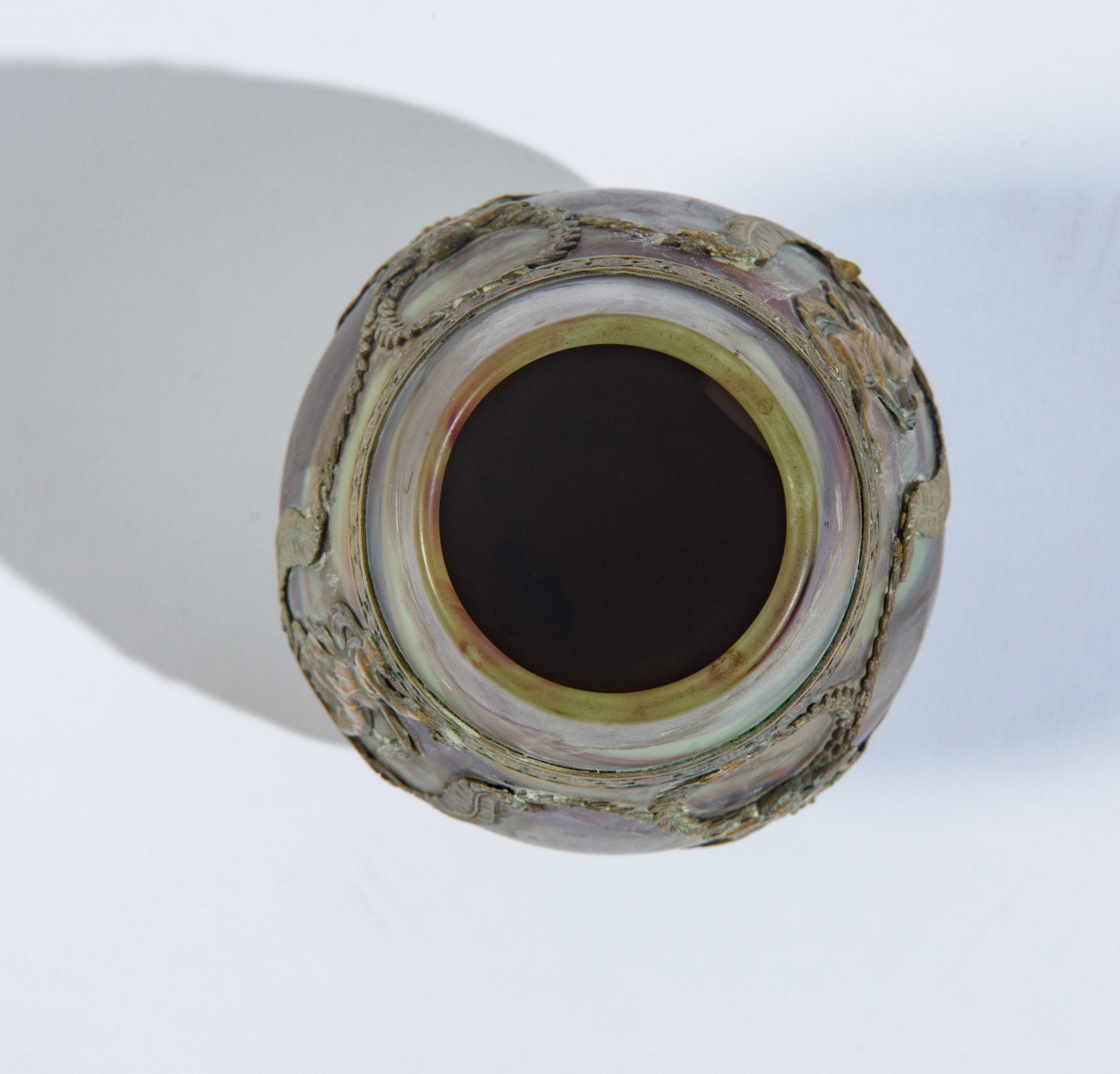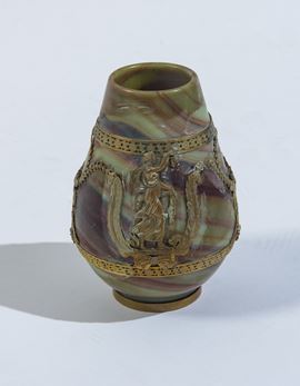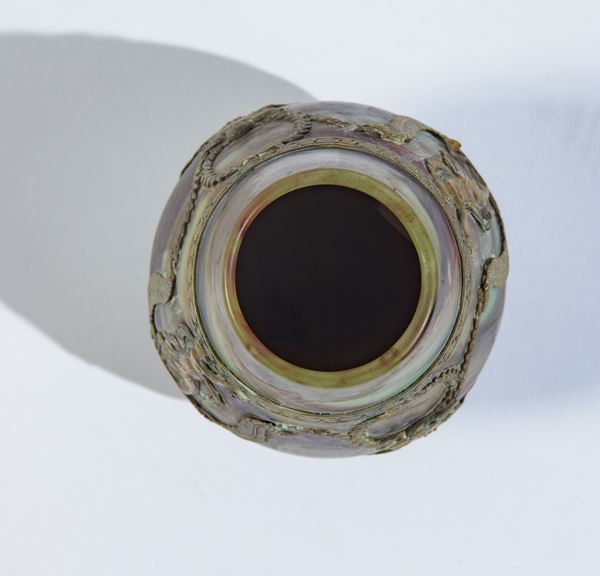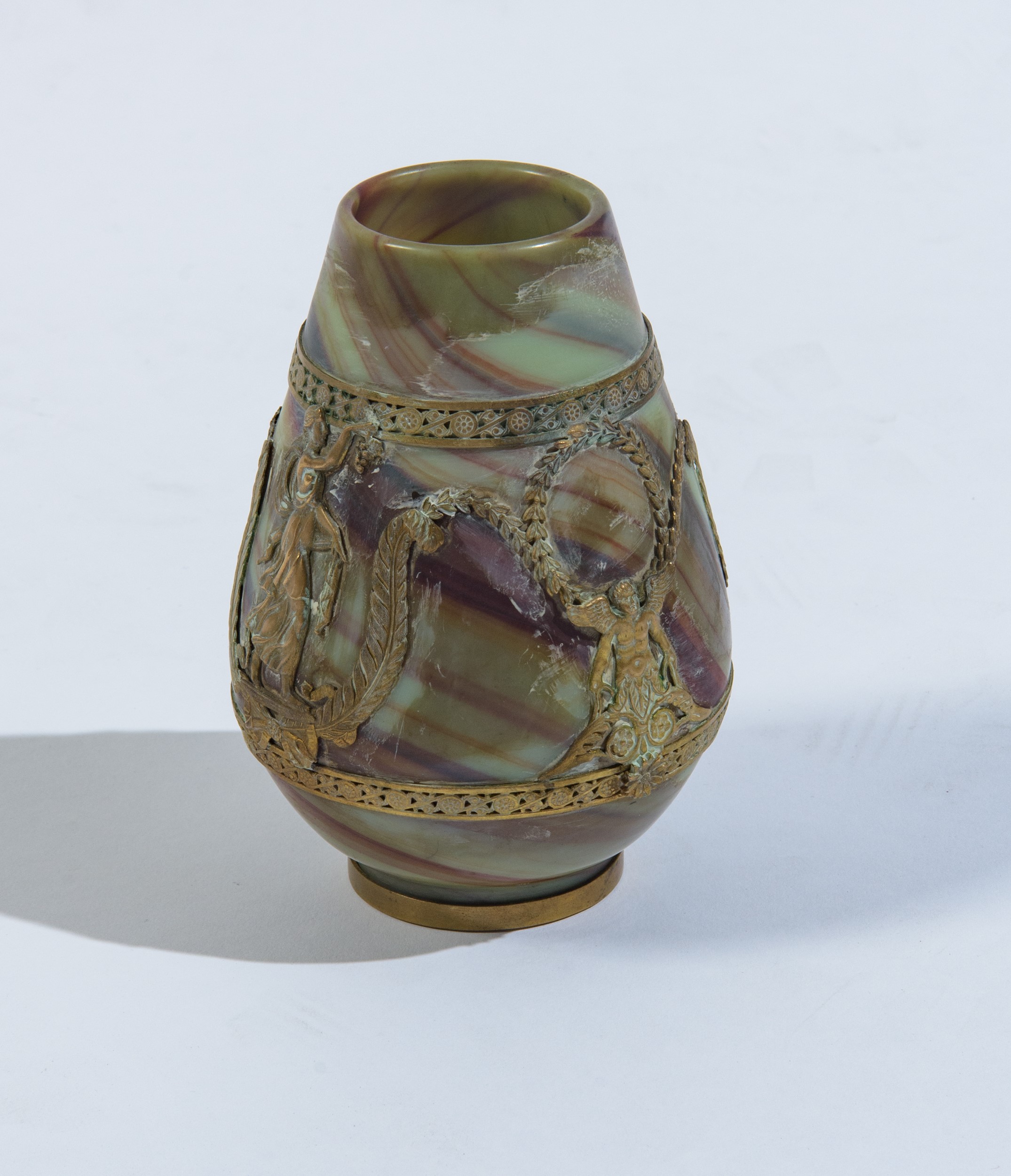 Vaso in vetro calcedonio a corpo ovoidale, arricchito da una montatura in bronzo dorato con figure classiche, festoni e motivi neoclassici.