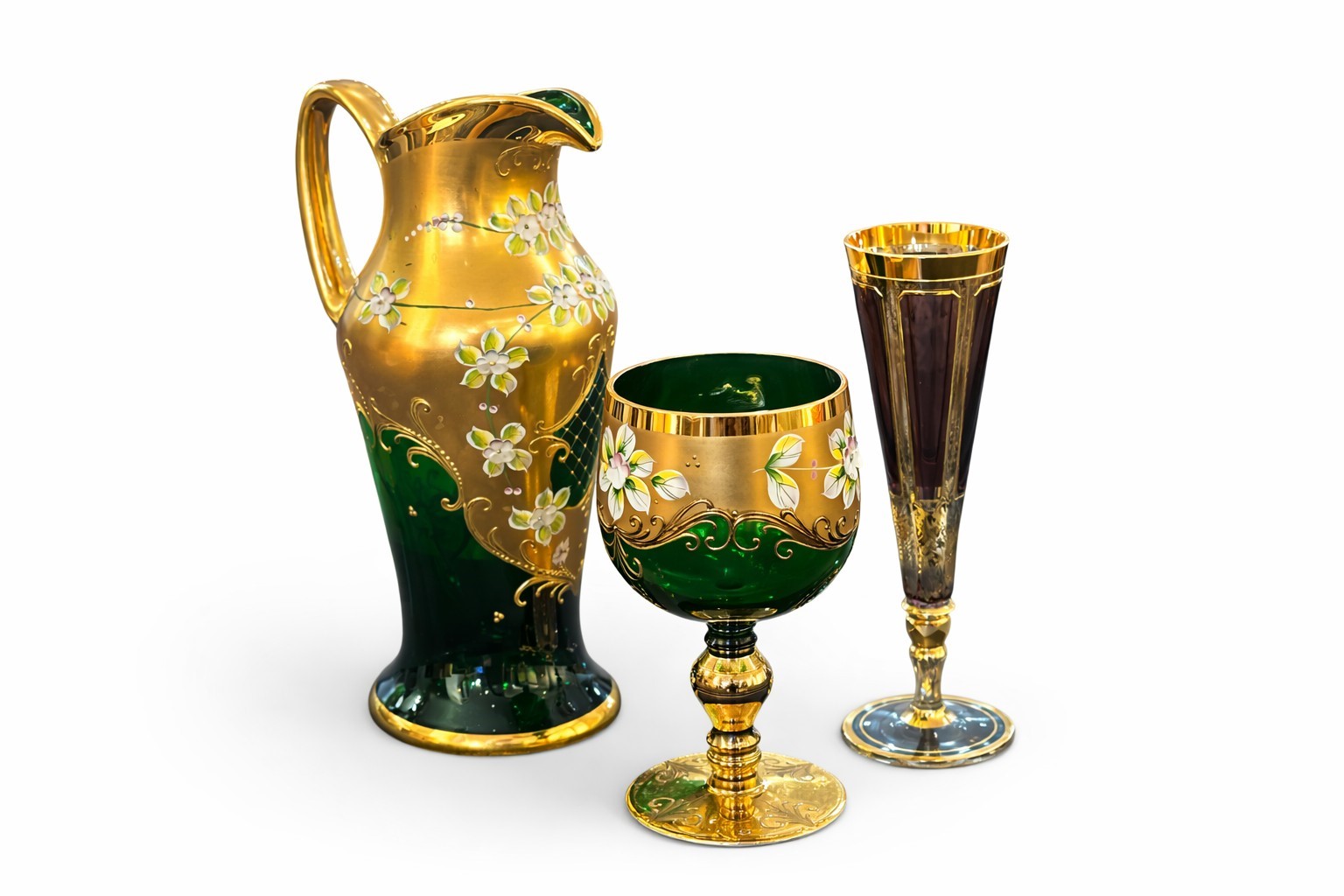 Con decorazioni floreali. In aggiunta, un calice di pertinenza e un flute.