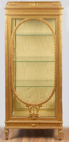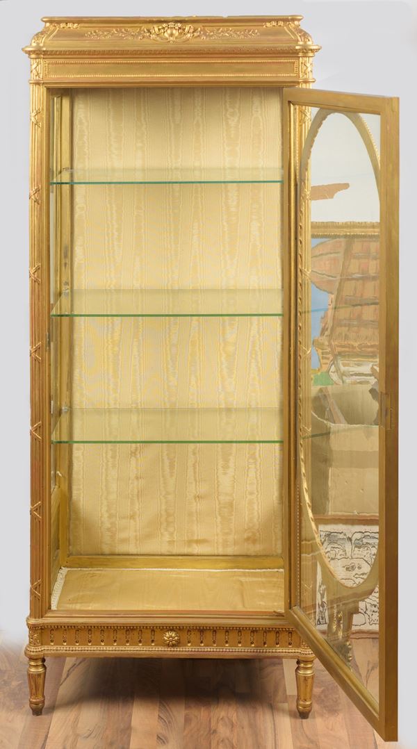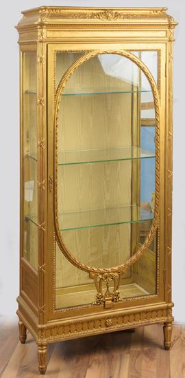 Elegante vetrina in legno intagliato e dorato, di forma rettangolare, poggiante su piedi troncopiramidali scanalati. Fronte con anta vetrata centrata da riserva ovale incorniciata da motivo a treccia, con ricco elemento decorativo a festone e fiocco nella parte inferiore. Fianchi scanalati con motivi geometrici e floreali, fascia inferiore ornata da decori a rosette e motivi classici. Interno rivestito e dotato di ripiani in vetro.